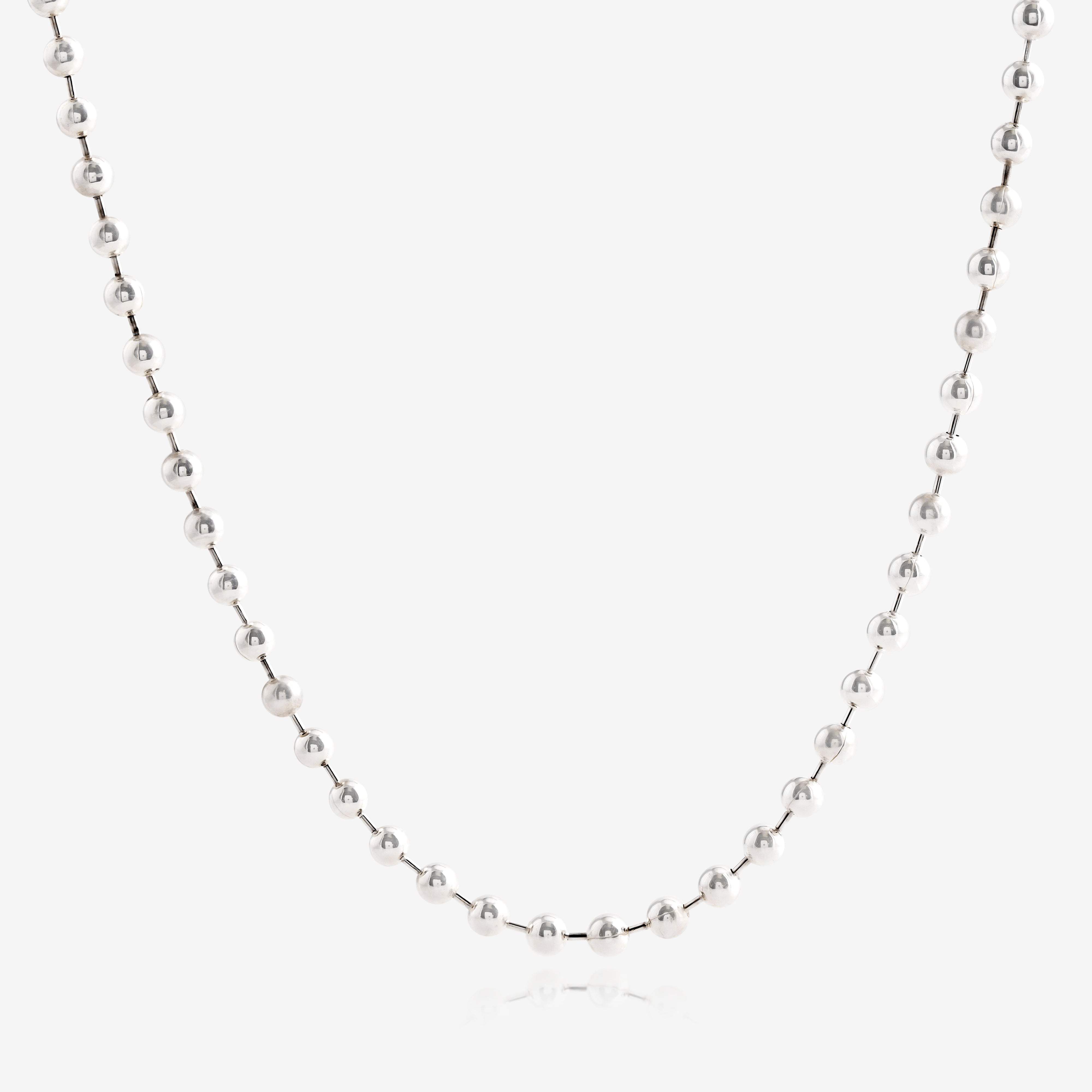 The chain is crafted in solid 925 silver with evenly spaced 5 mm polished balls linked along a sturdy core. Each bead is finished to a smooth, reflective surface so the chain has a steady, subtle shine from every angle. A secure lobster lock keeps the necklace in place and makes it easy to fasten on your own. The result is a piece that feels solid in the hand and comfortable on the neck.