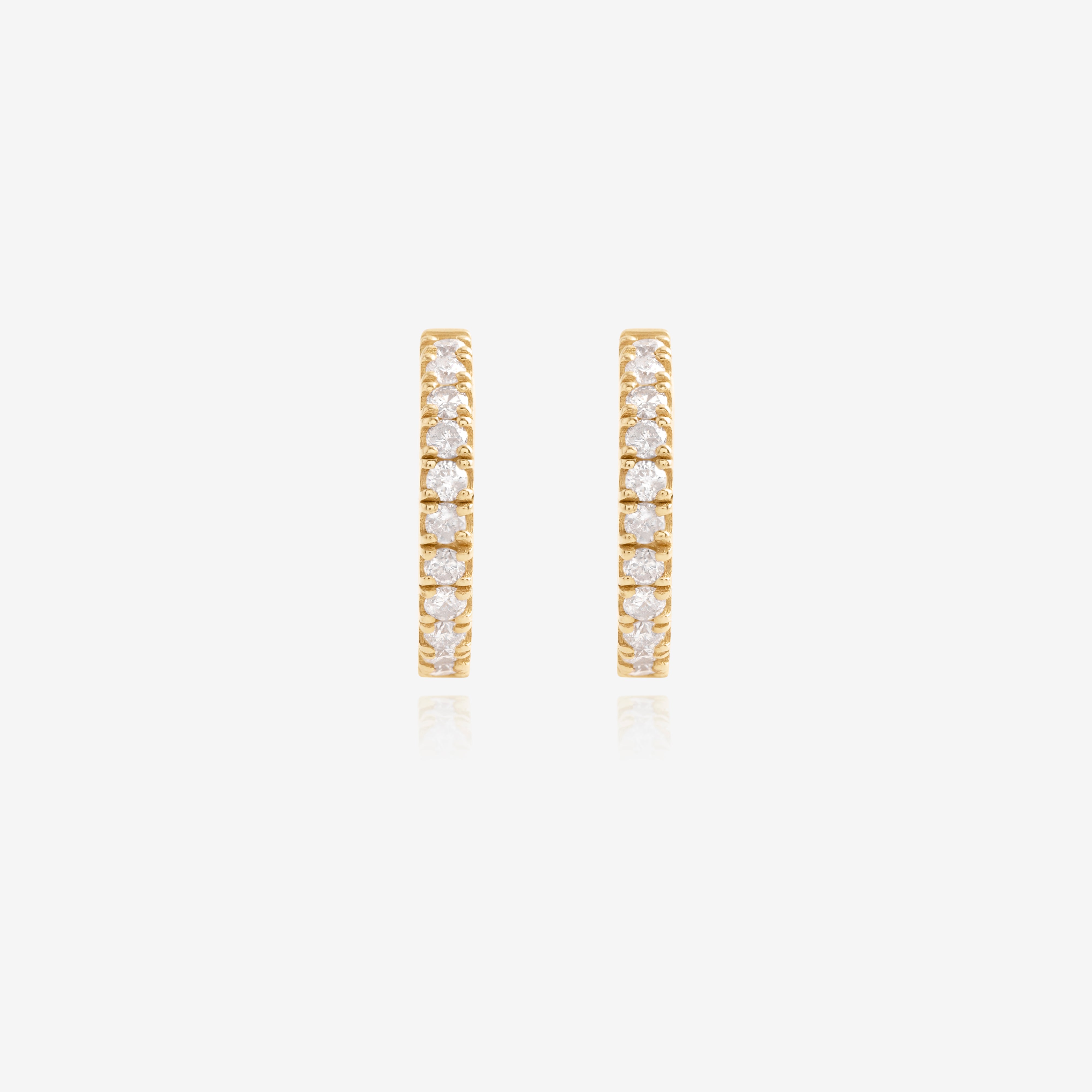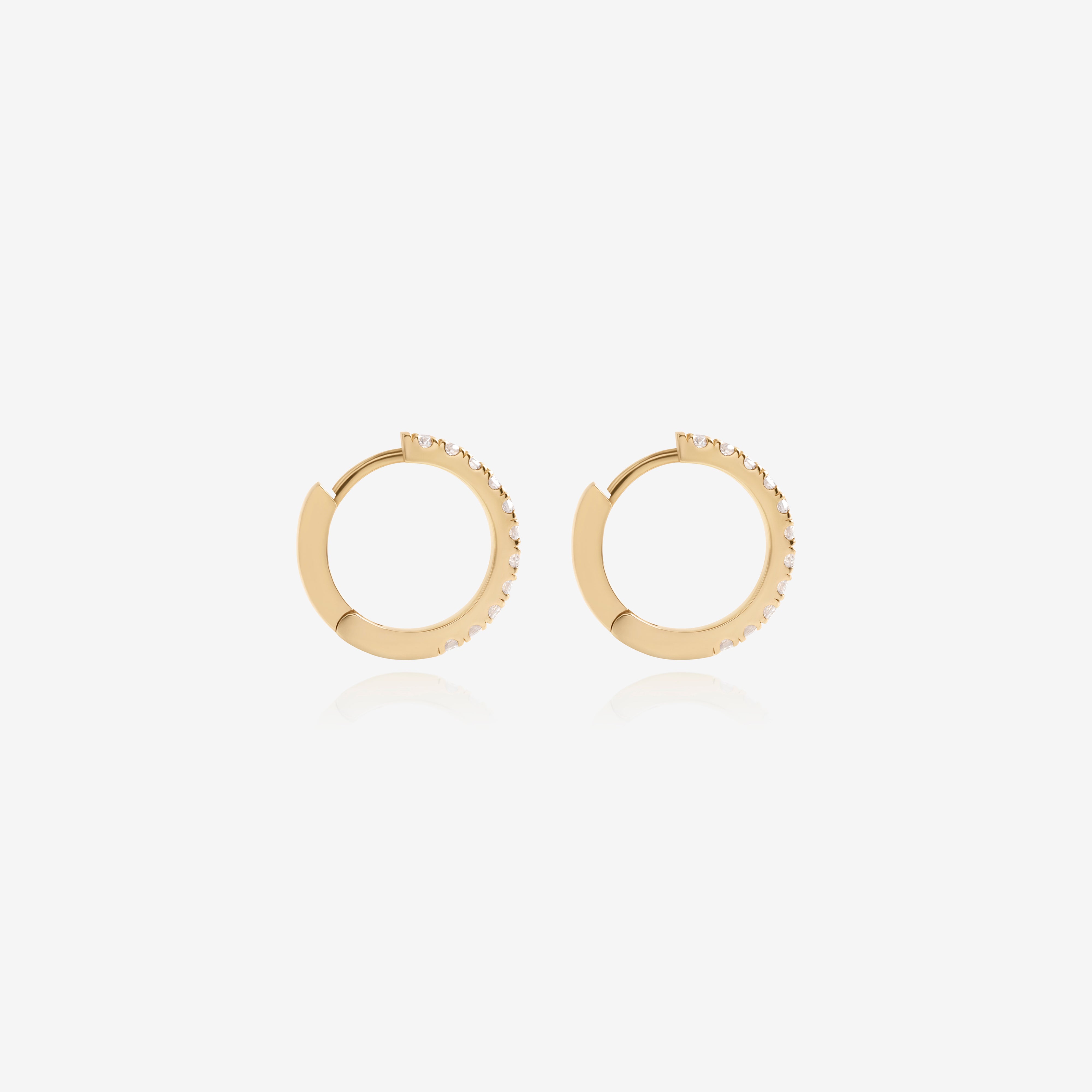 Each hoop is crafted in 14 karat gold and set with natural round brilliant diamonds along the outer curve. The total carat weight is 0.28, with stones graded G–H in colour and VS–SI in clarity for a clean, bright look. The diamonds measure approximately 1.8 mm, giving the hoops a refined pavé surface instead of a chunky, stone-heavy feel. With a 14.5 mm diameter, they sit close to the ear, creating a neat circle of gold and light. A secure hinge closure keeps them in place throughout the day.