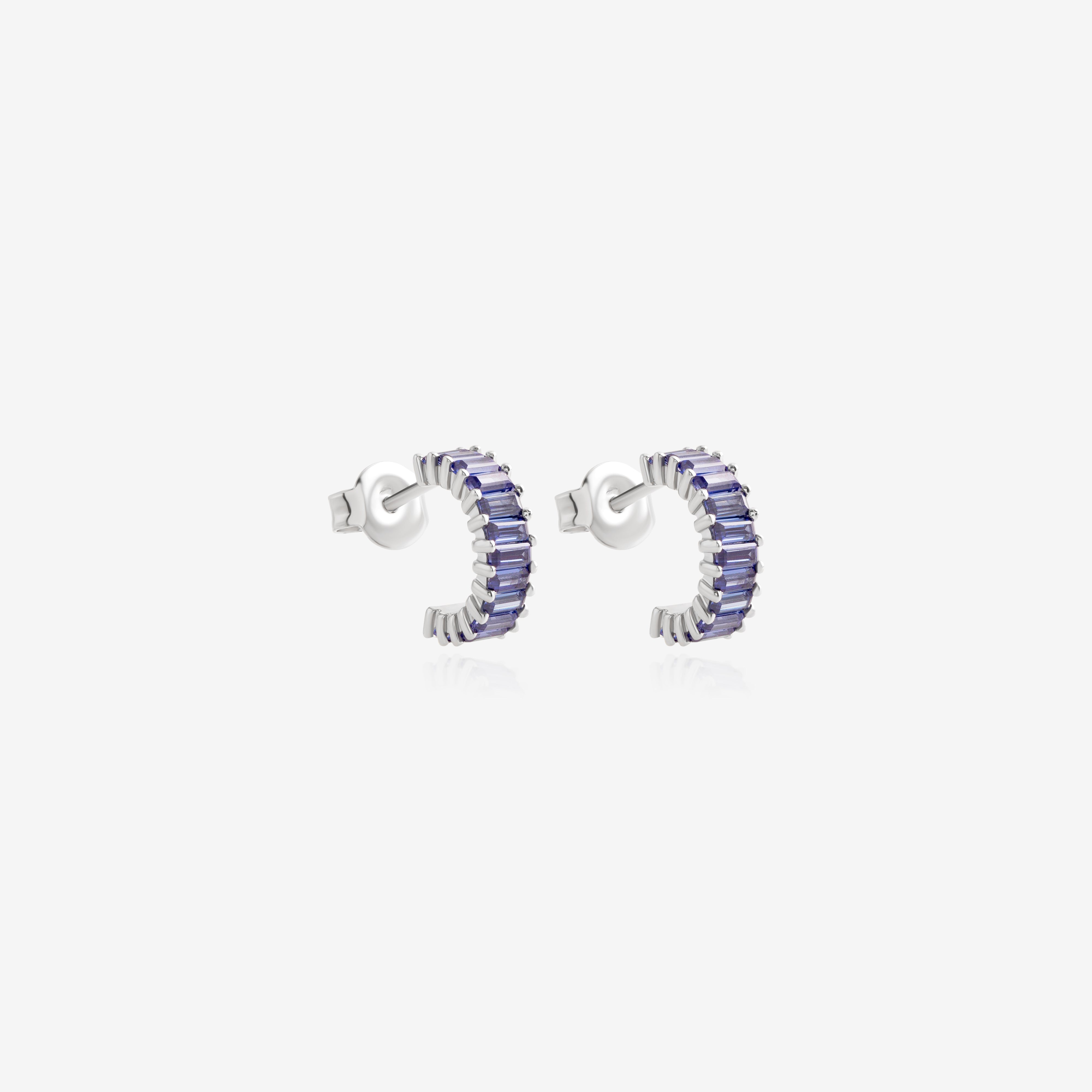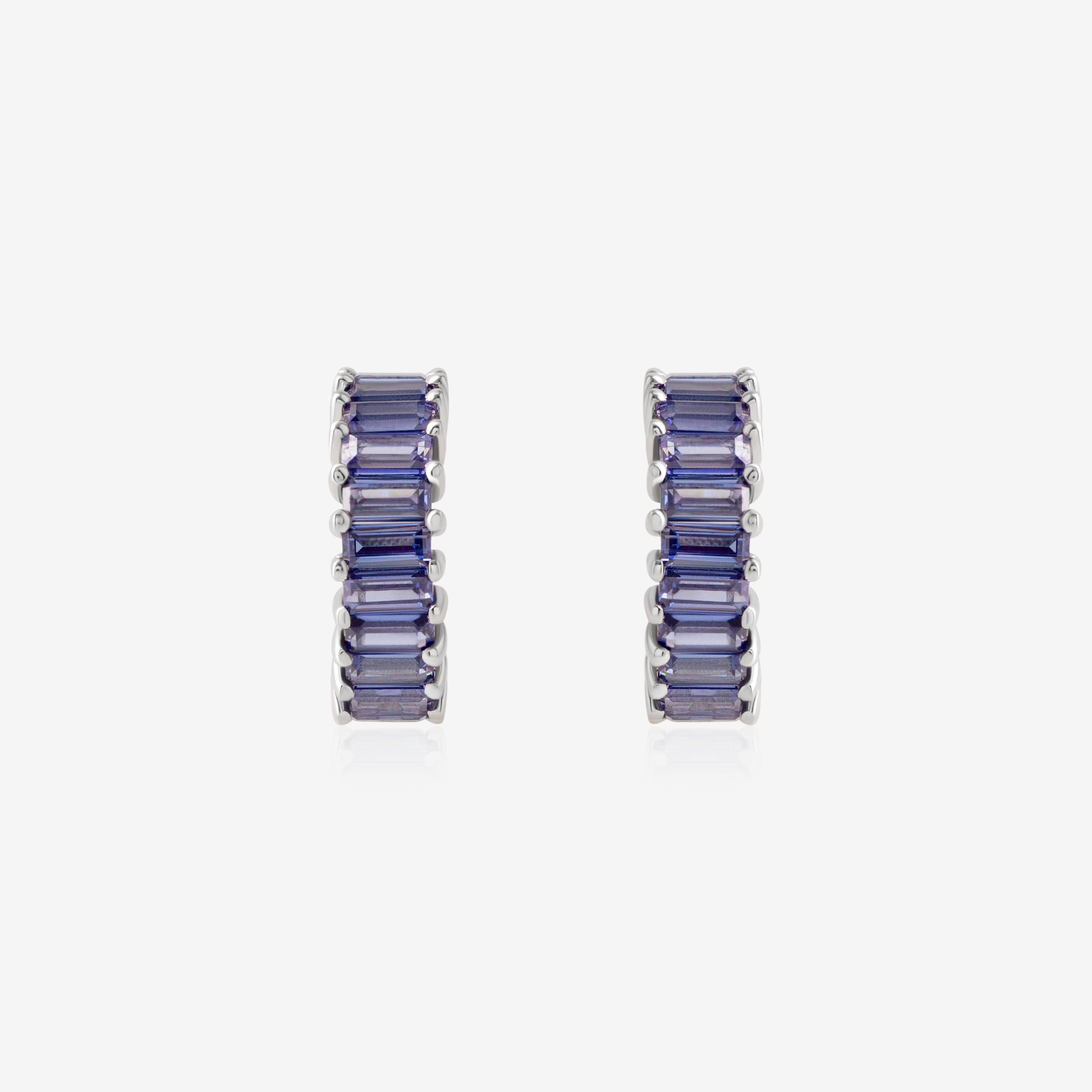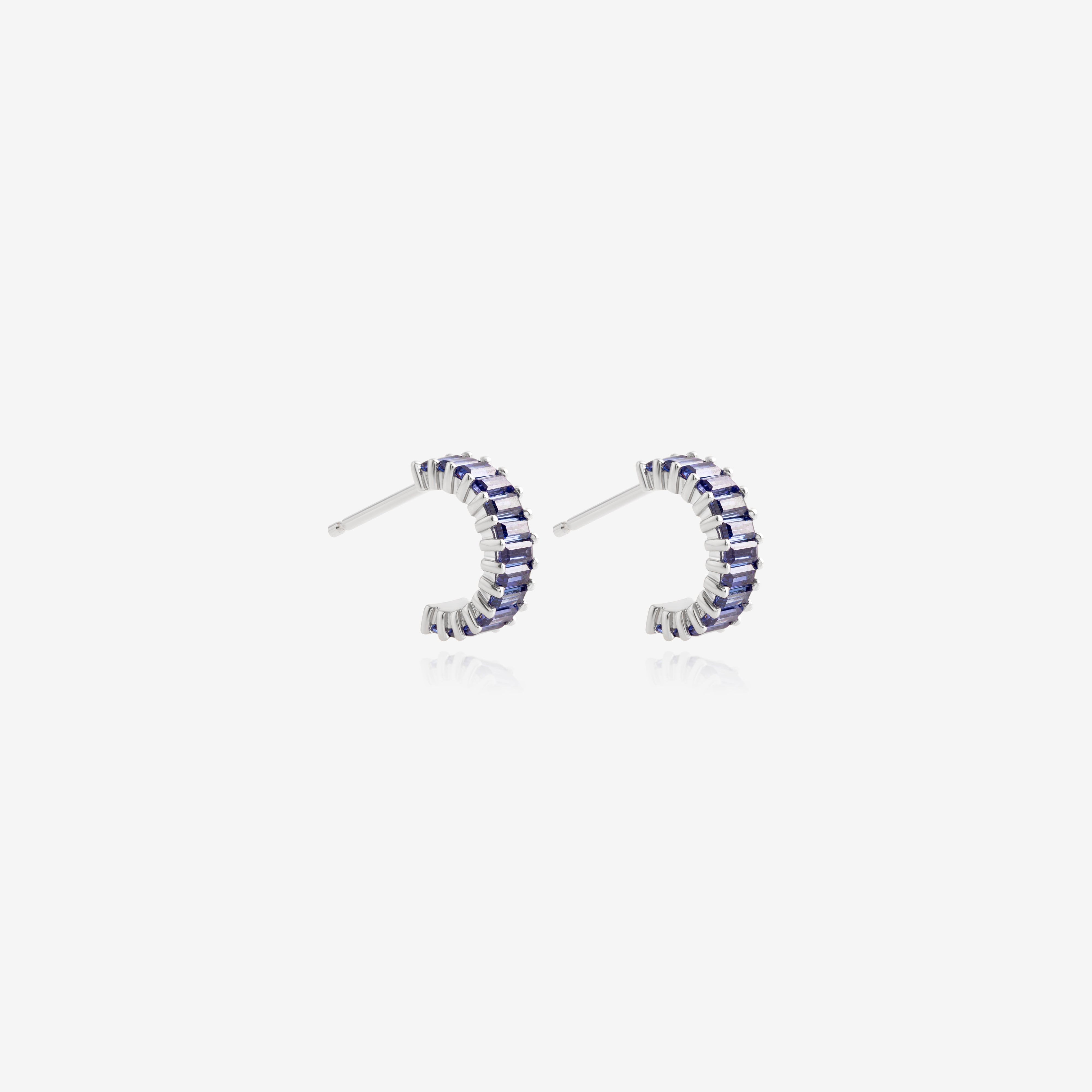 These huggies are for the woman who wants colour at the ear without going oversized. The Azure Baguette Sapphire Huggies are crafted in 18K white gold and set all the way across the front with rows of blue baguette sapphires, so you see a clean band of colour from every angle. At 10 mm in diameter, they sit close to the lobe and feel like a small ring of light rather than a full hoop.
