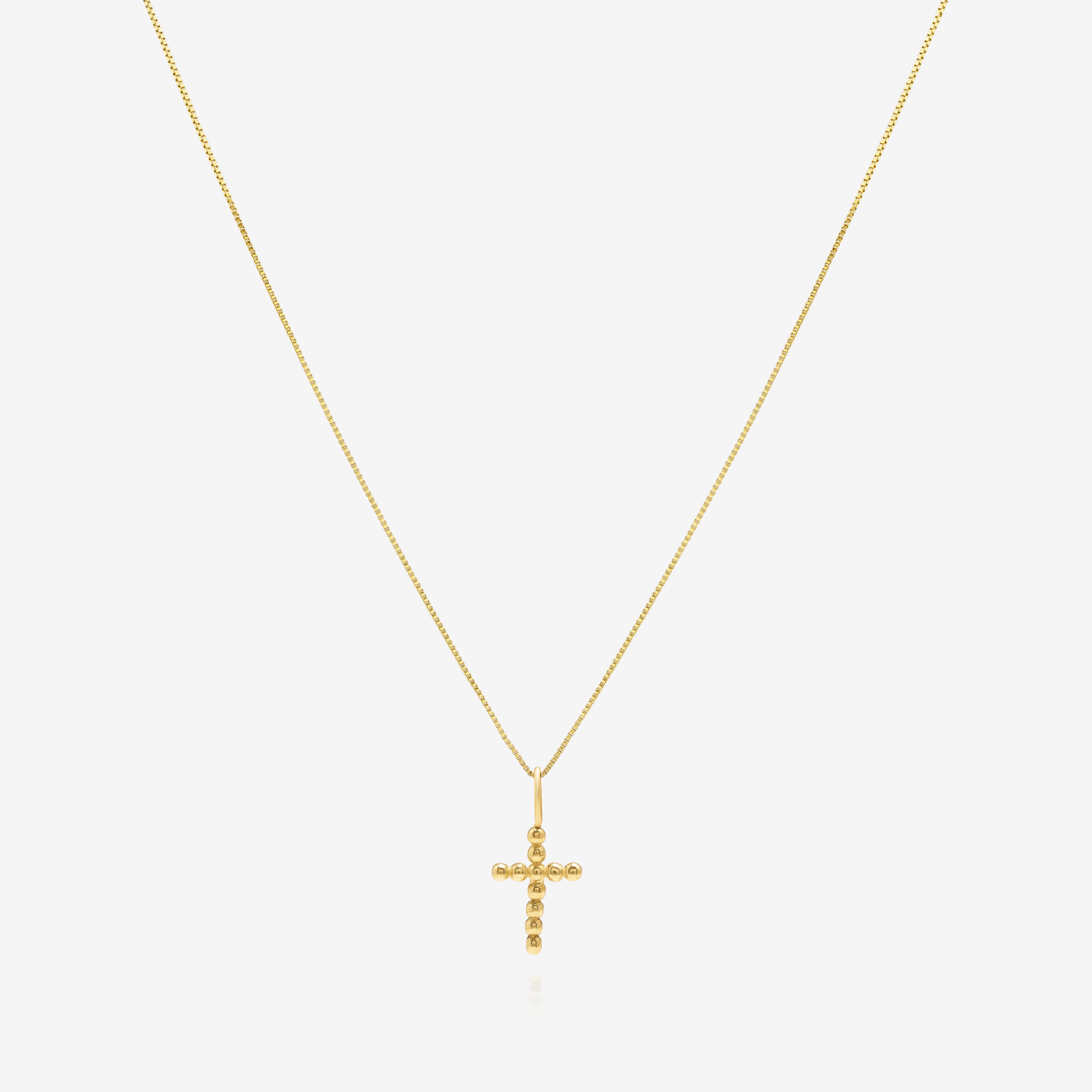 Each sphere is placed with intention. The beaded design gives the cross texture and depth without adding weight. The 16-inch box chain keeps it close and secure. This is 14 karat gold built to last. No hollow construction. No fragile links. Just solid craftsmanship that holds up to daily wear.