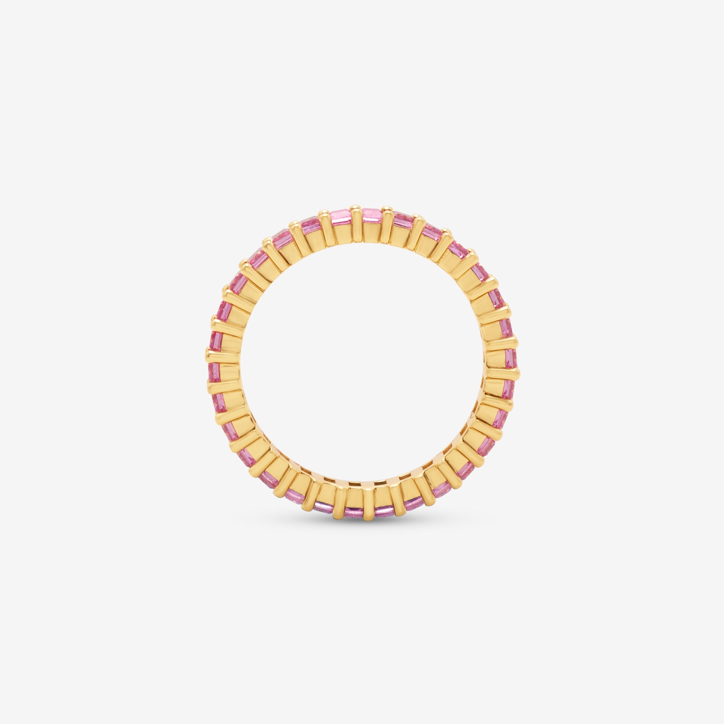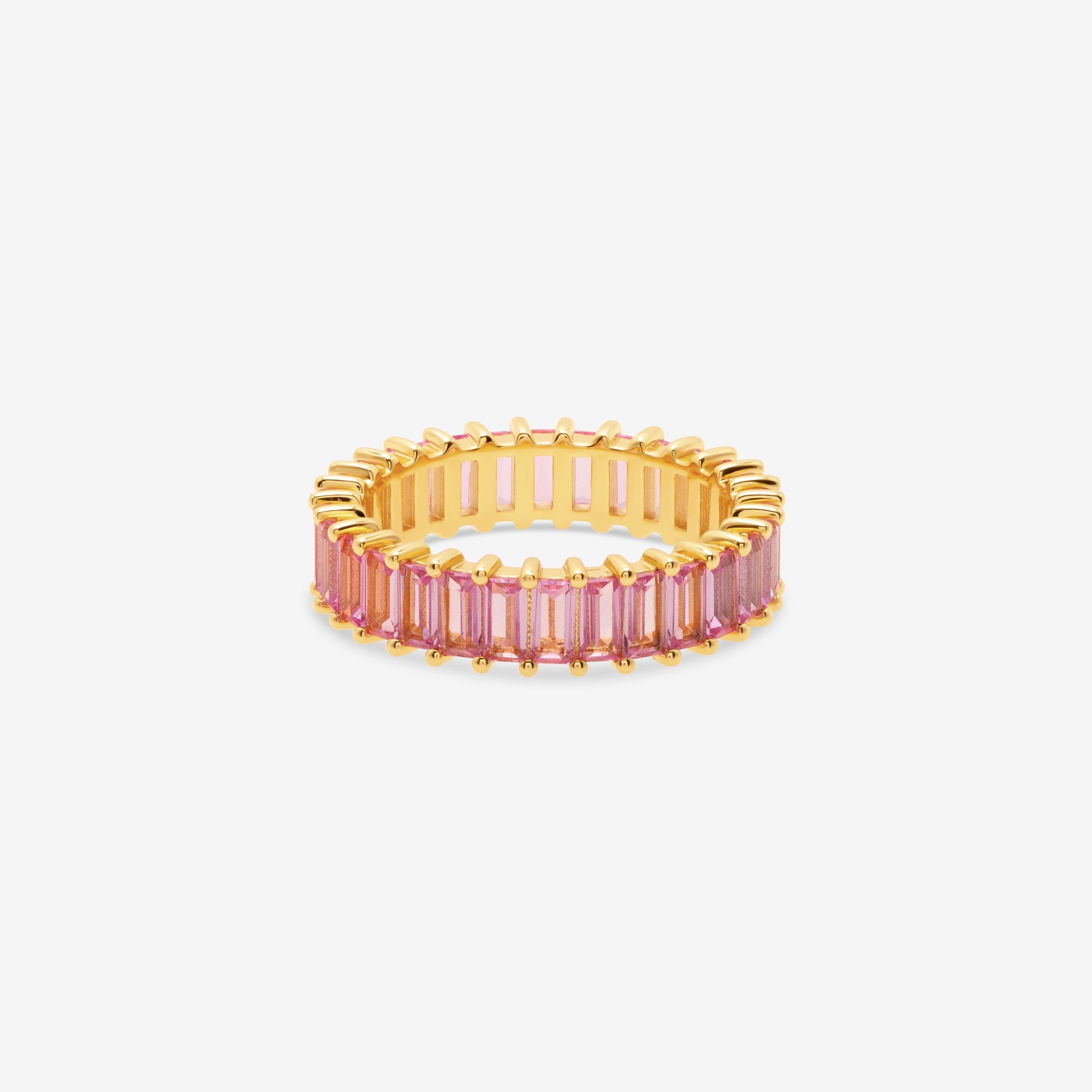 Moisanite offers exceptional brilliance exceeding diamond's fire, creating vibrant pink sparkle. The baguette cuts provide clean, linear elegance while the channel setting protects stones for daily wear. The 14K gold construction ensures durability. The eternity design means continuous pink color wraps the entire band.