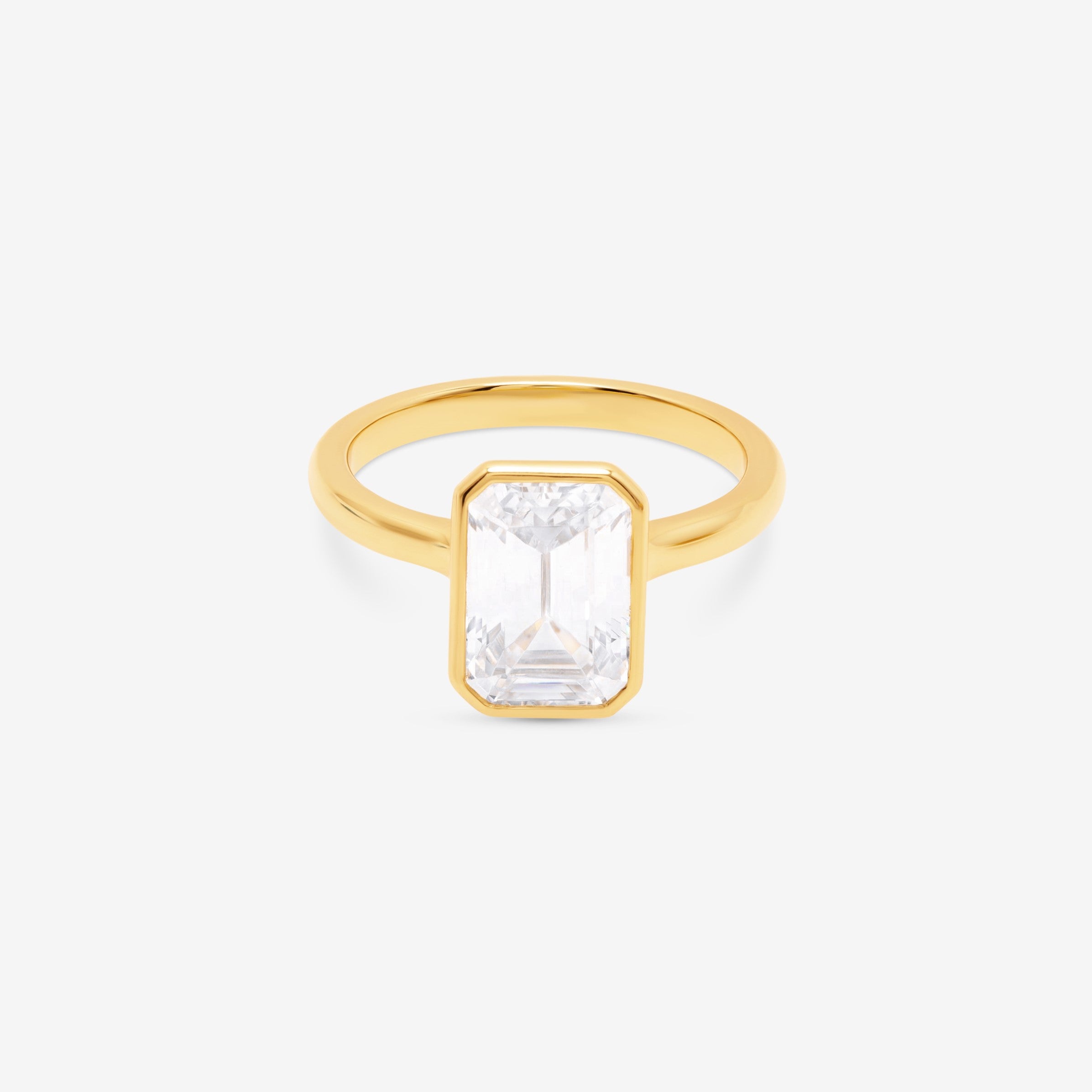 Modern sophistication meets timeless elegance. This emerald cut lab-grown diamond bezel ring showcases a stunning 2.01-carat diamond with exceptional E color and VS1 clarity, graded Excellent for cut quality. Set in a sleek bezel of 14-karat gold, this contemporary design offers both security and style for everyday luxury.