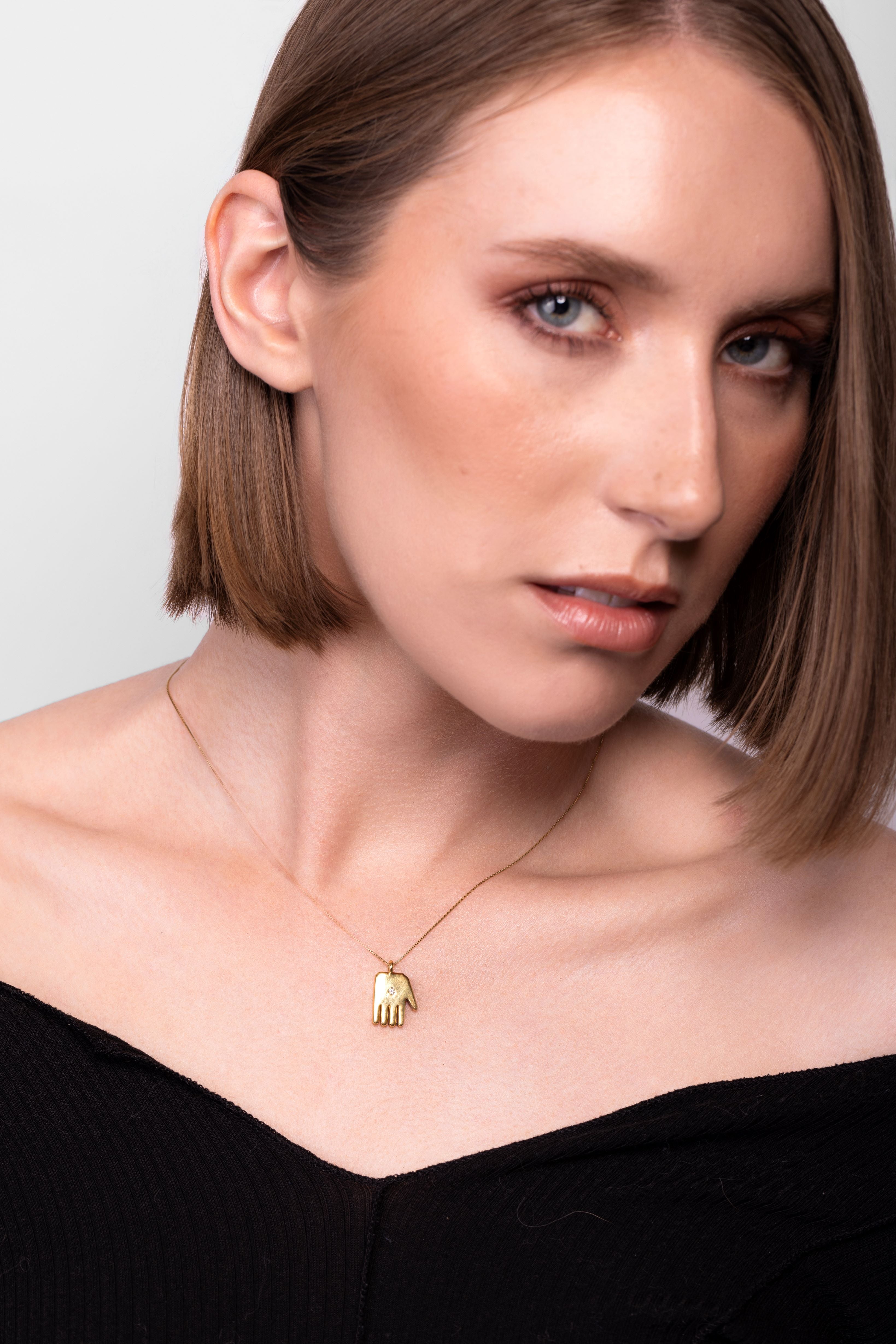 The pendant is crafted in solid gold with smooth, rounded edges and defined fingers that give it a sculptural profile without adding weight. A small round diamond is flush‑set into the centre of the palm, creating a focused point of light that echoes the “watchful eye” often depicted in traditional Hamsa motifs. The adjustable 16–18 inch chain threads through a simple bail, keeping the pendant flat against the skin and comfortable for all‑day wear.