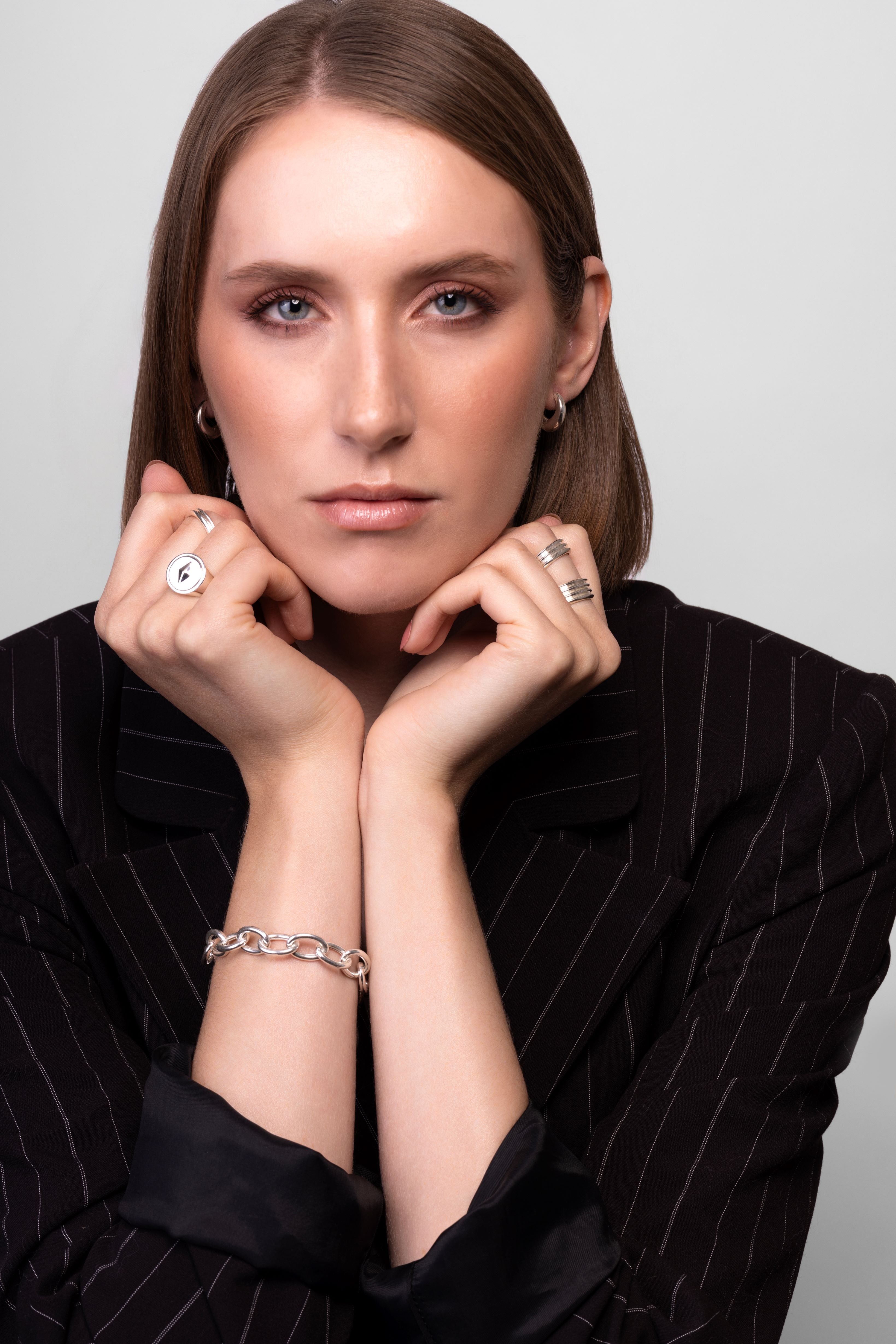 The Legacy ring revives the signet's ancient tradition through a distinctive lozenge shape. Signet rings have carried personal seals and family crests since Mesopotamian times, marking documents with wax impressions that authenticated identity and power. The lozenge - a diamond-shaped face turned at an angle - creates a bold canvas for future personalization while honoring centuries of signet tradition. Crafted in solid 925 sterling silver, this substantial ring brings historical gravitas to modern minimalism.