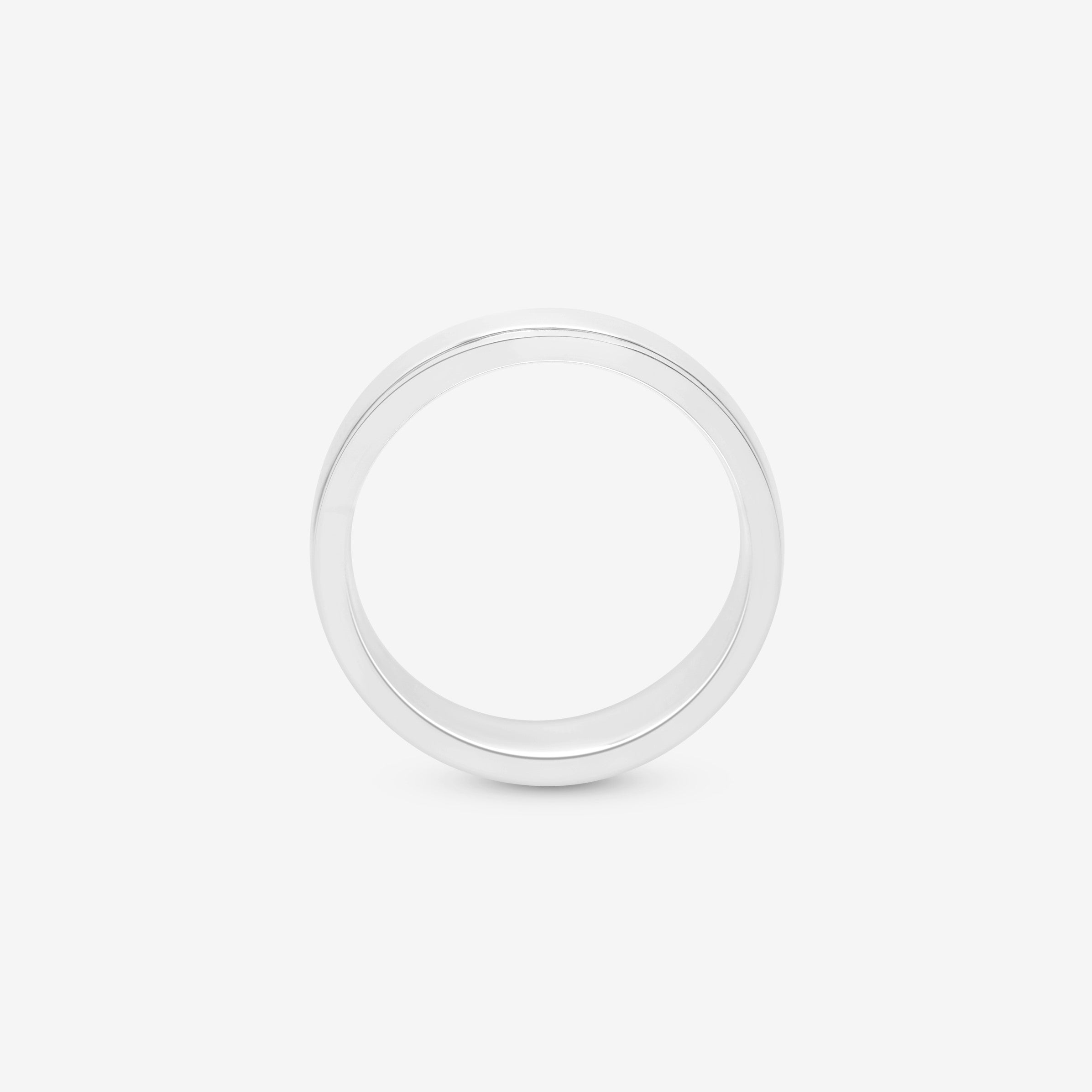 The wide flat profile creates substantial surface area while the center groove adds linear detail. Solid 925 sterling silver ensures weight and durability befitting the wide width. The polished finish highlights the clean geometry while the groove creates subtle shadow play.