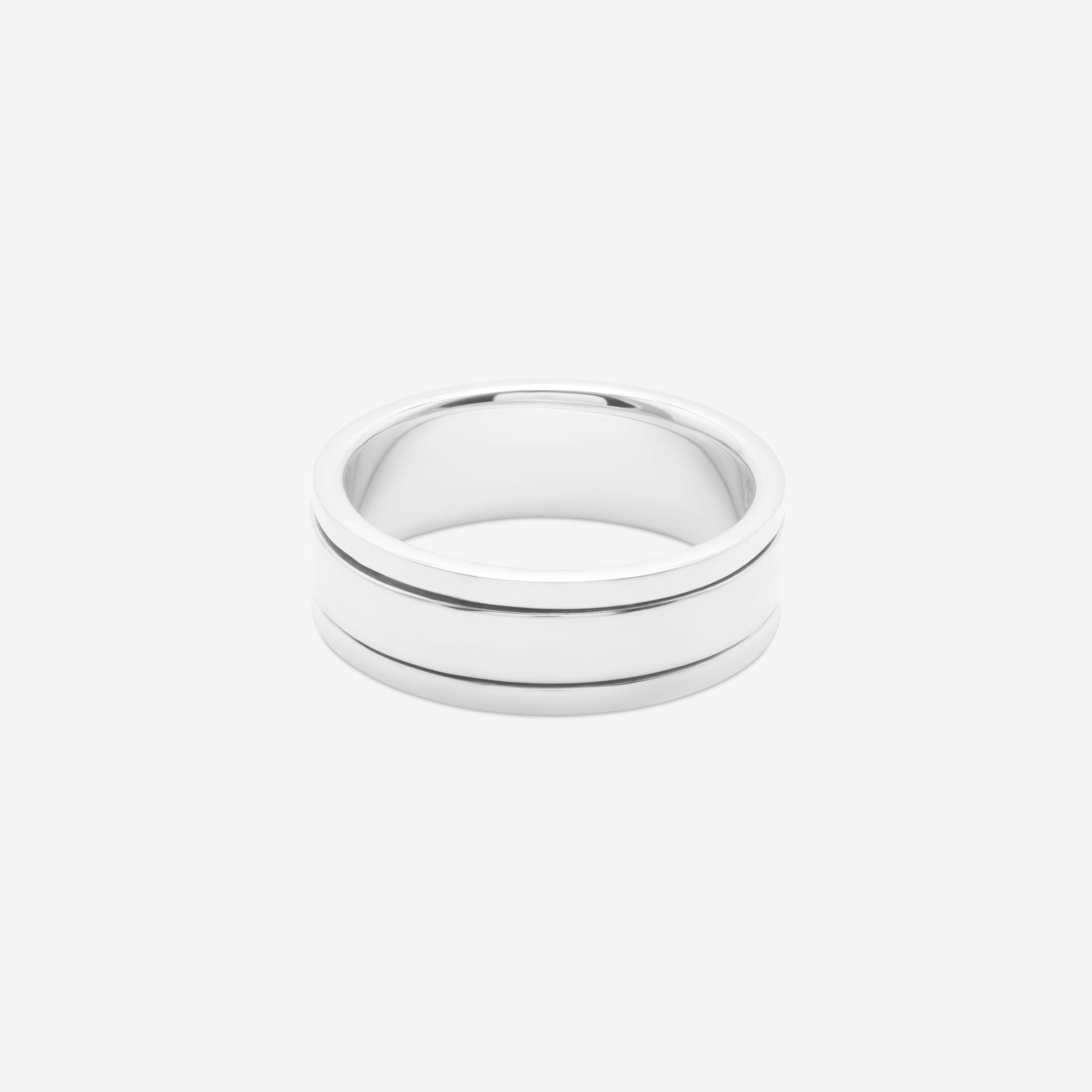 The Meridian band draws its name from the line that divides east from west. A single clean groove runs through the band's center like a meridian line across a globe, creating visual symmetry through division. The wide 7.5mm profile provides substantial presence while the flat surface offers modern minimalism. The center groove adds subtle dimension without complexity, like a horizon line that grounds the design. Crafted in solid 925 sterling silver, this band balances bold width with refined simplicity.