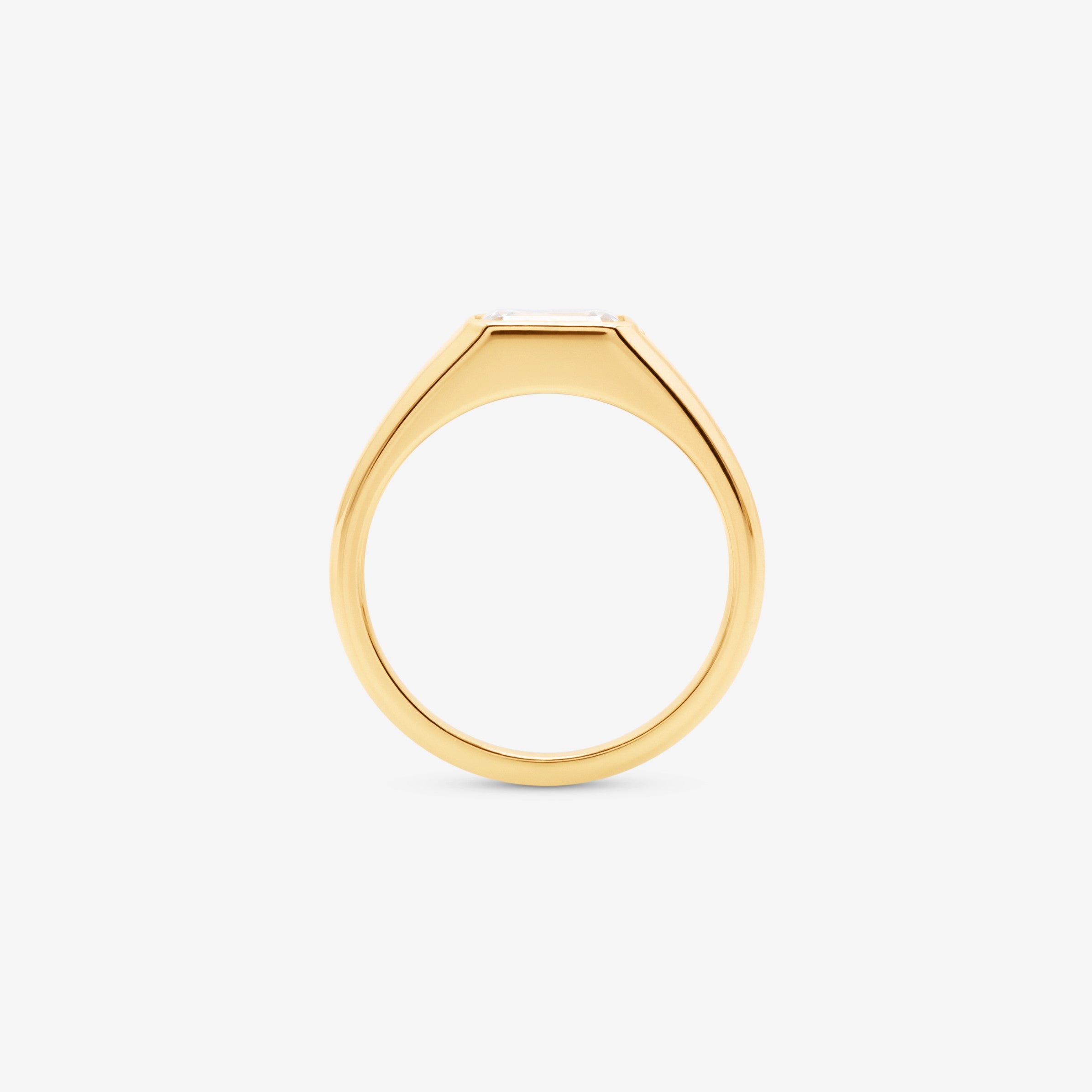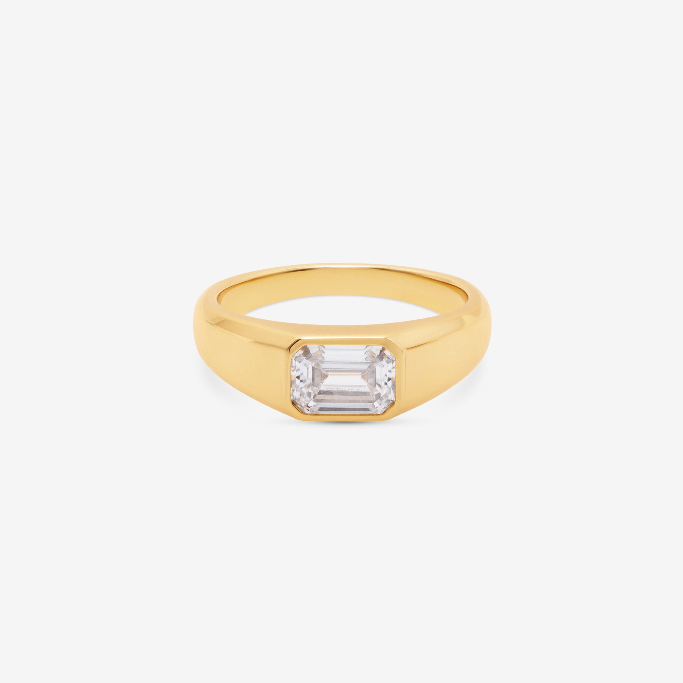 The Serenity ring features a 2.0ct emerald-cut lab diamond in a sleek bezel setting with 18K gold. The step-cut facets create elegant brilliance while the bezel offers modern protection and style.